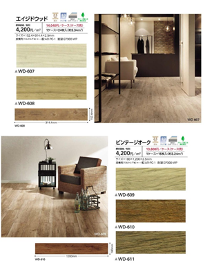 木に馴染むのは、ナチュラル素材を活用すること。使い古しの木材や建設現場で捨てられている木材を使っても味わいがでるでしょう。みなさんがよく使うサンゲツでいえば、下記のビンテージオークのようなイメージ写真でしょう。フロアタイルですので実際には木造の建物には音の問題があるのでお勧めしませんが、イメージとしてみてください。